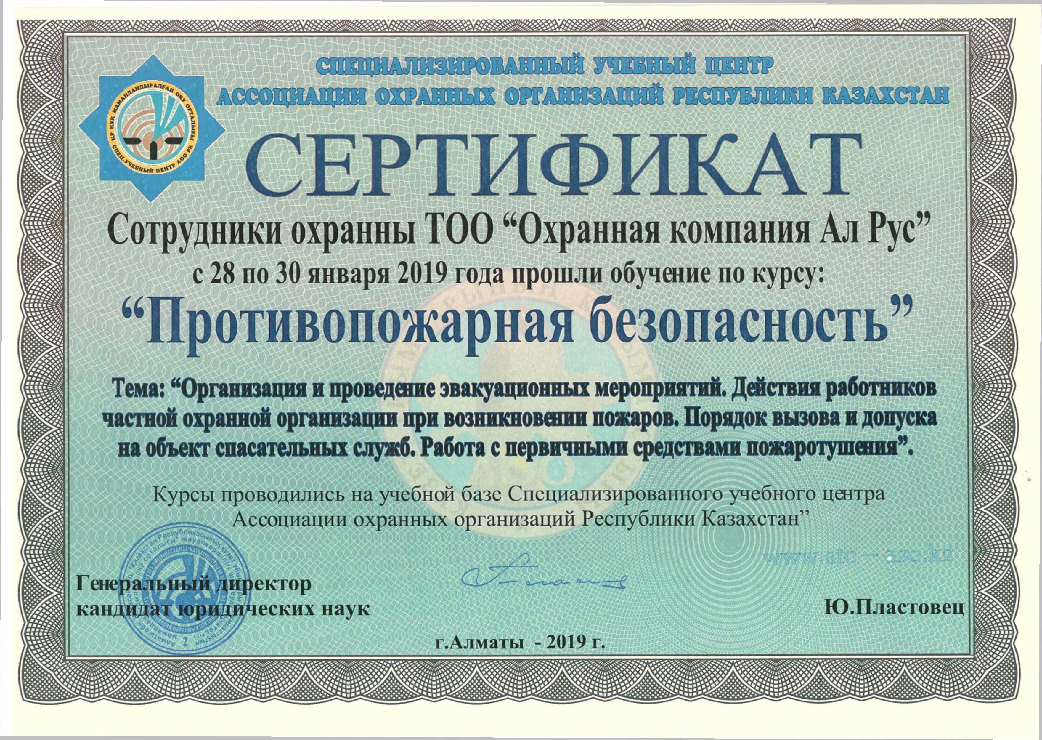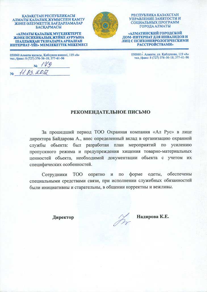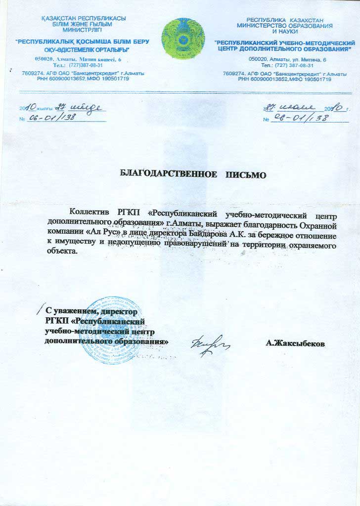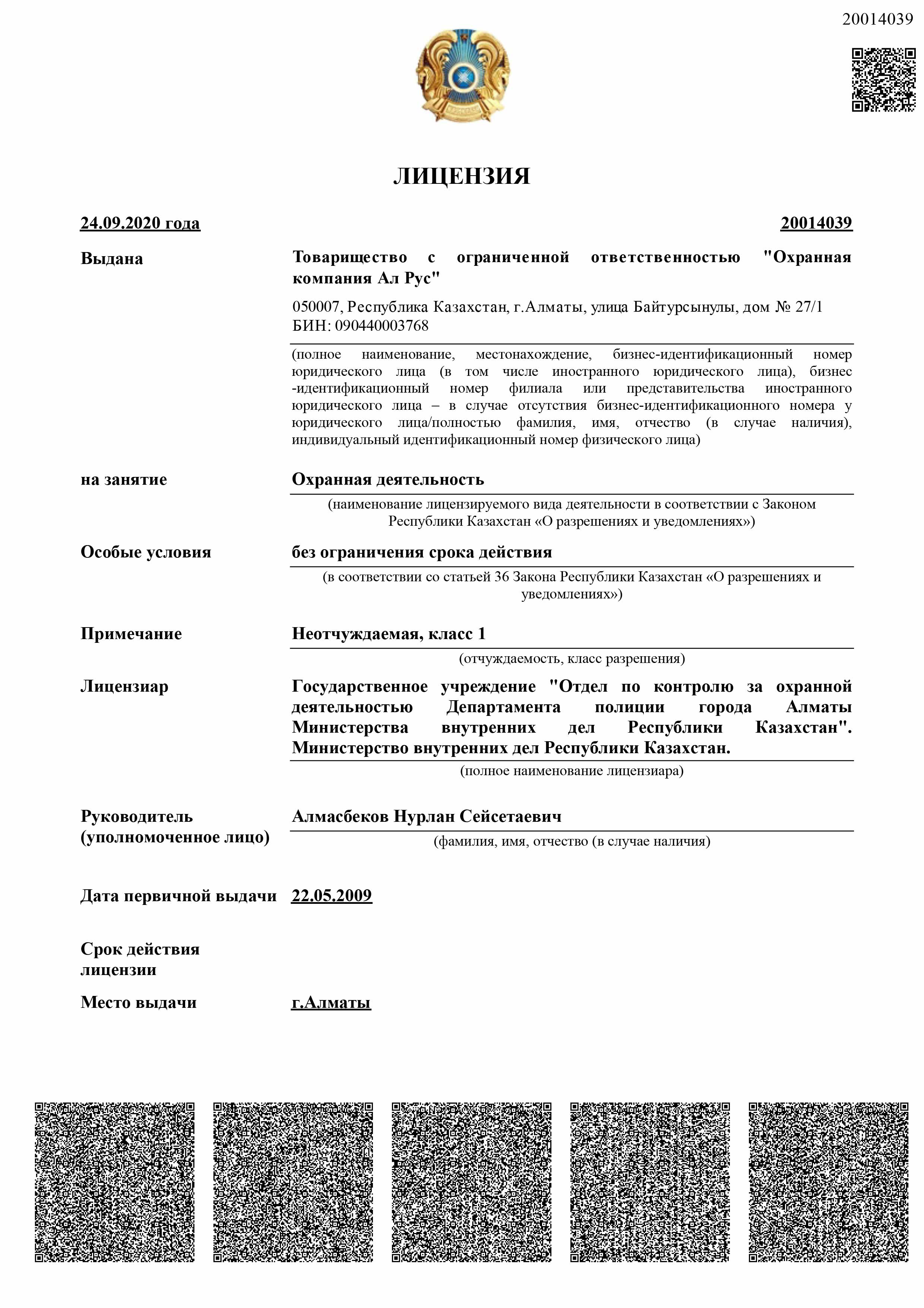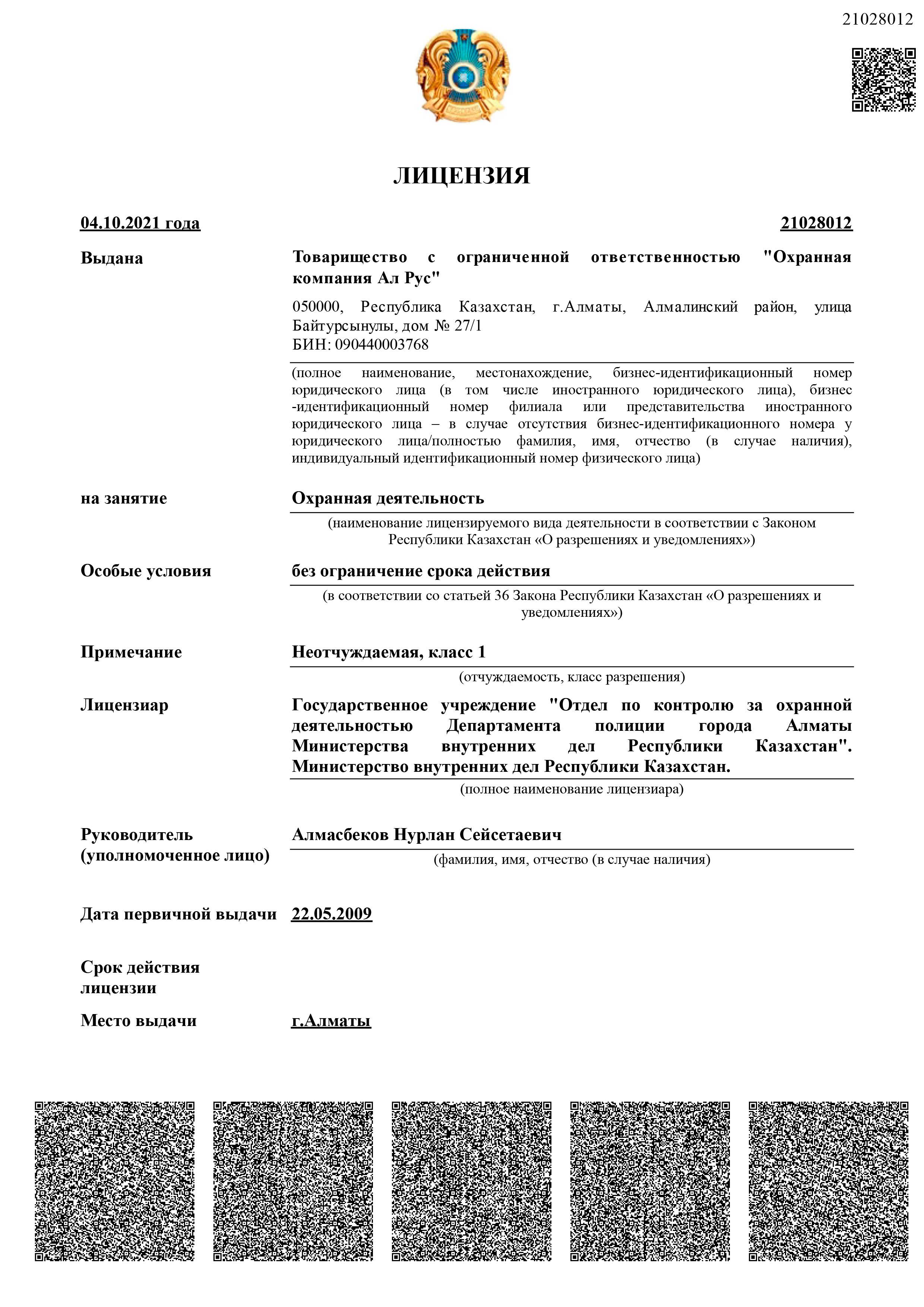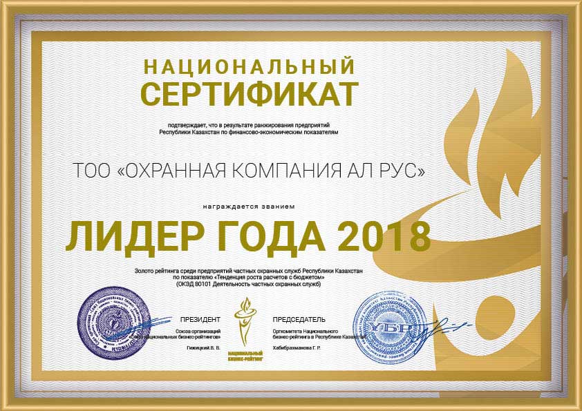 «Охранная компания Ал Рус» с 2009 года оказывает комплекс услуг по защите имущества физических и юридических лиц от противоправных посягательств, обеспечивает общественный порядок и организует пропускную систему на охраняемых объектах. Компания обладает огромным опытом сотрудничества с производственными предприятиями, медицинскими учреждениями, акиматами, торговыми сетями, бизнес-центрами, государственными учреждениями республиканского масштаба, в том числе образовательными. В 2019 году компания прошла предварительный квалификационный отбор потенциальных поставщиков по Стандарту АО «Фонд национального благосостояния «Самрук-Қазына» и достойно принимает участие в закупках по услугам охраны.