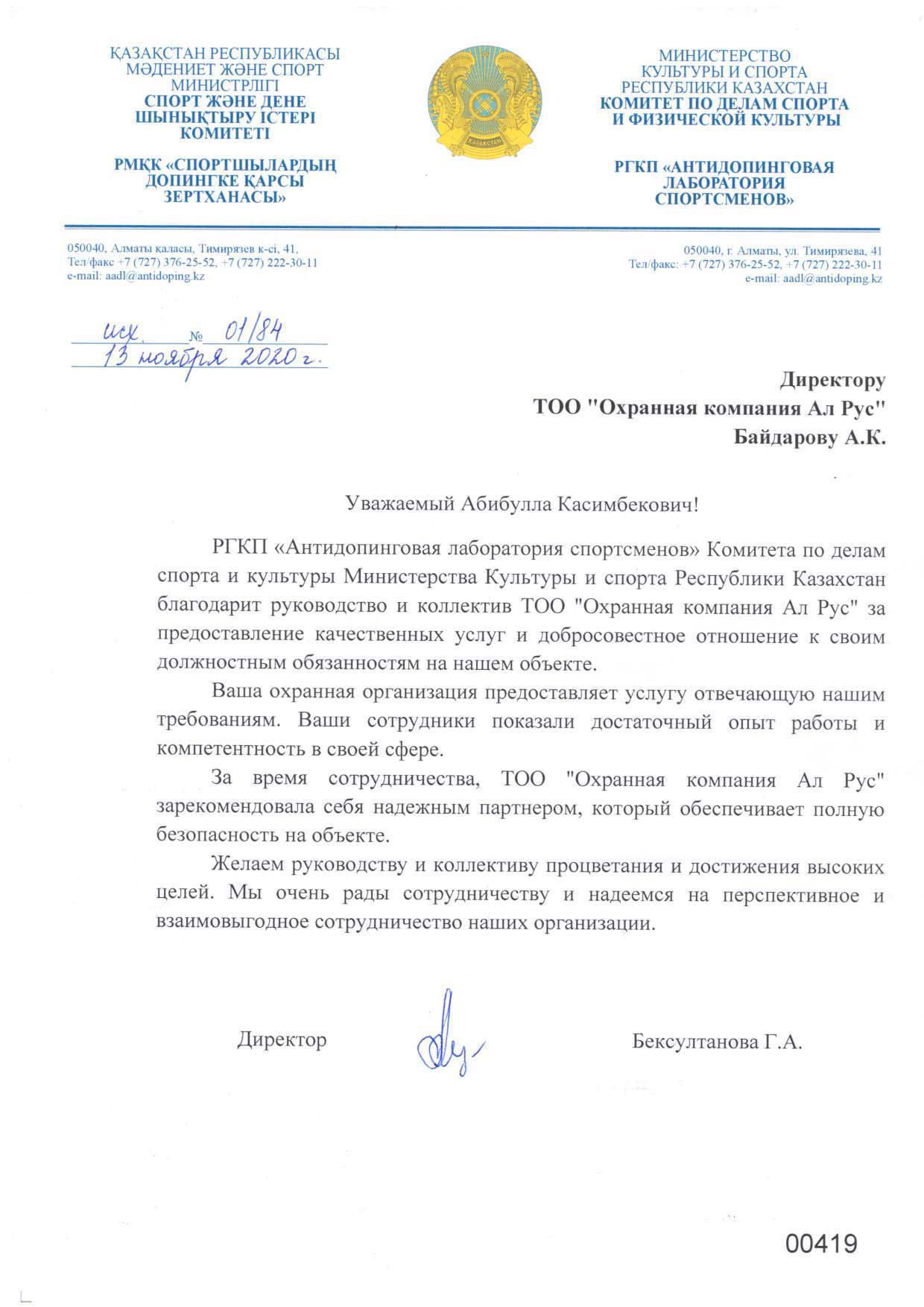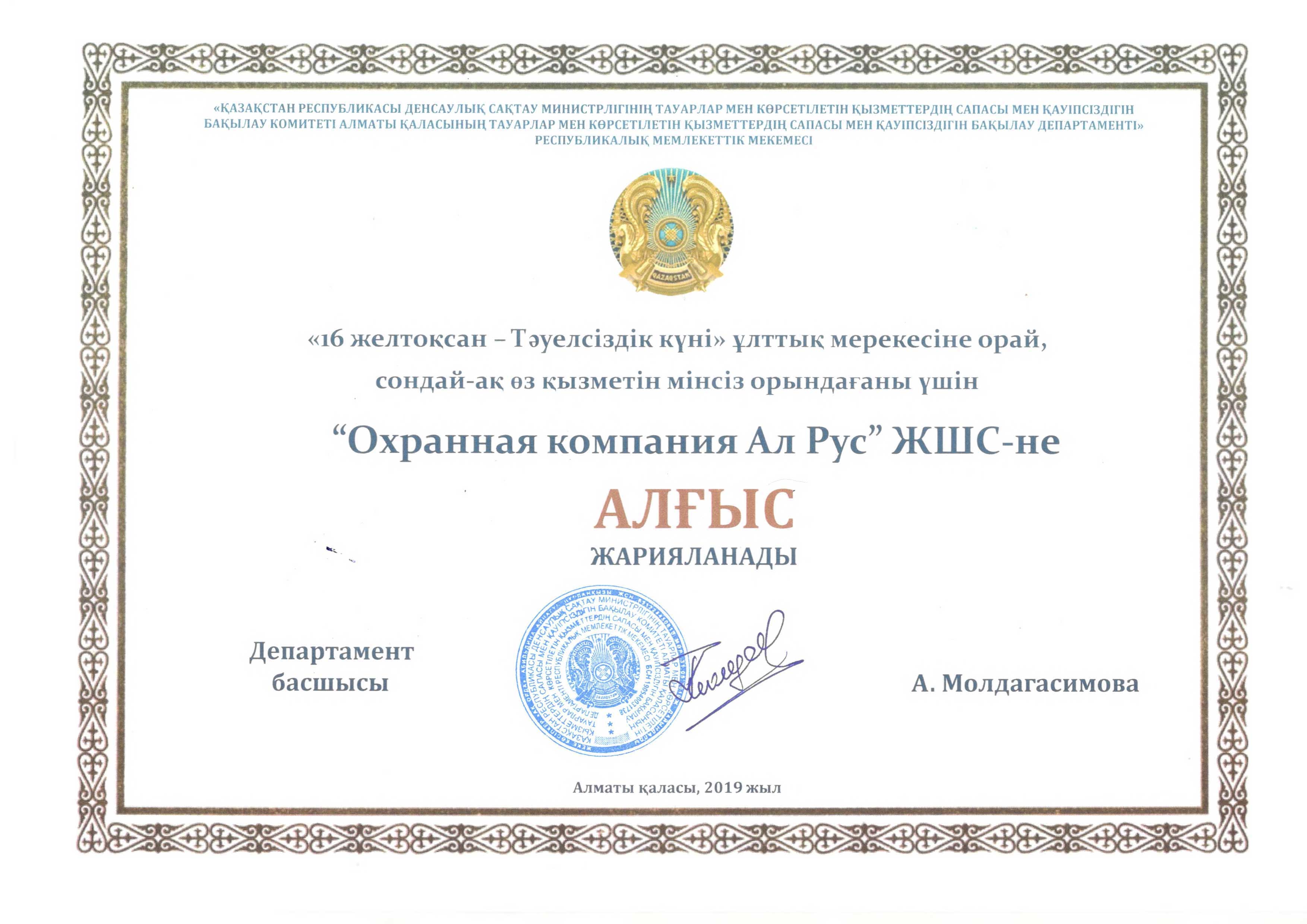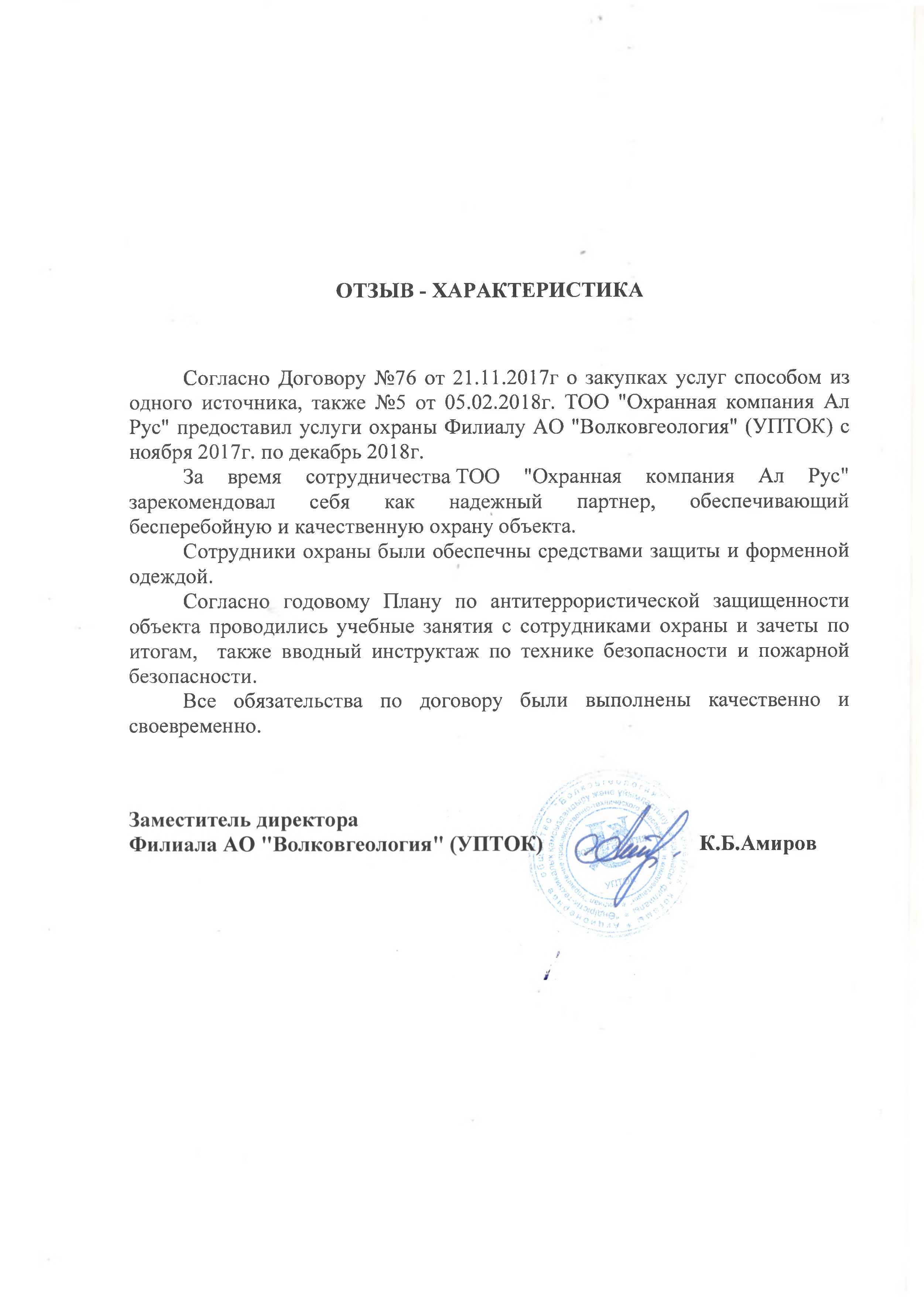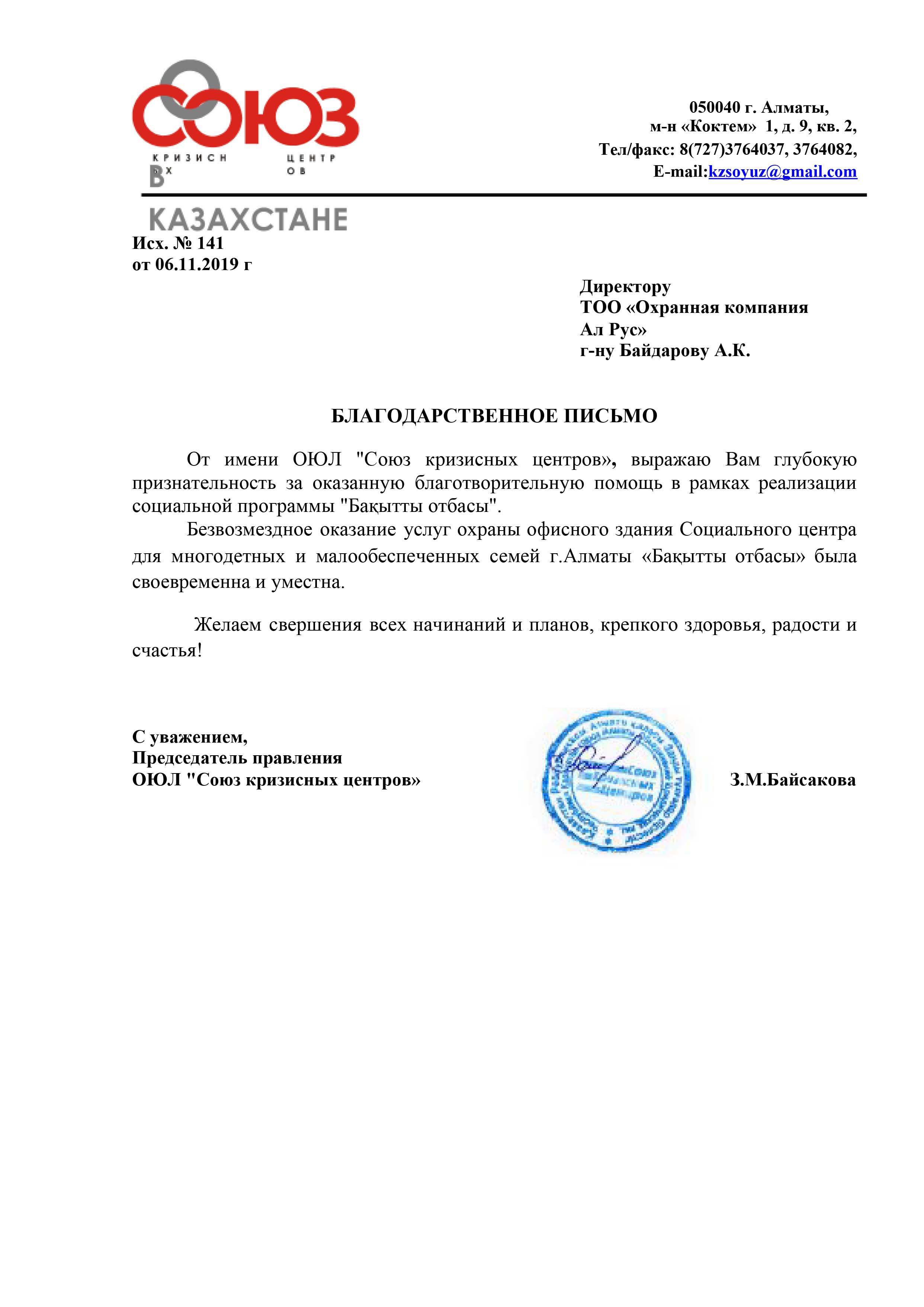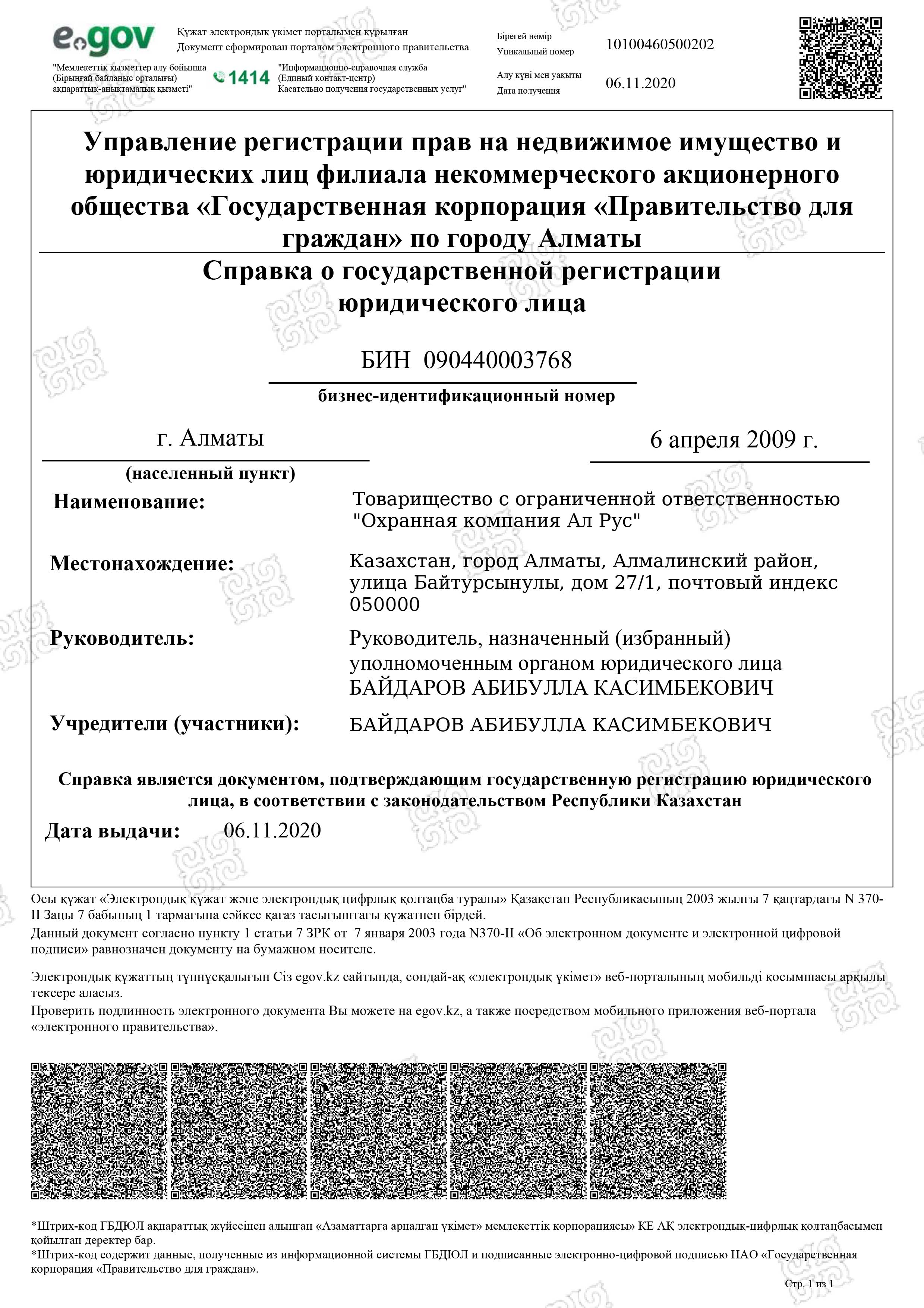«Охранная компания Ал Рус» с 2009 года оказывает комплекс услуг по защите имущества физических и юридических лиц от противоправных посягательств, обеспечивает общественный порядок и организует пропускную систему на охраняемых объектах. Компания обладает огромным опытом сотрудничества с производственными предприятиями, медицинскими учреждениями, акиматами, торговыми сетями, бизнес-центрами, государственными учреждениями республиканского масштаба, в том числе образовательными. В 2019 году компания прошла предварительный квалификационный отбор потенциальных поставщиков по Стандарту АО «Фонд национального благосостояния «Самрук-Қазына» и достойно принимает участие в закупках по услугам охраны.