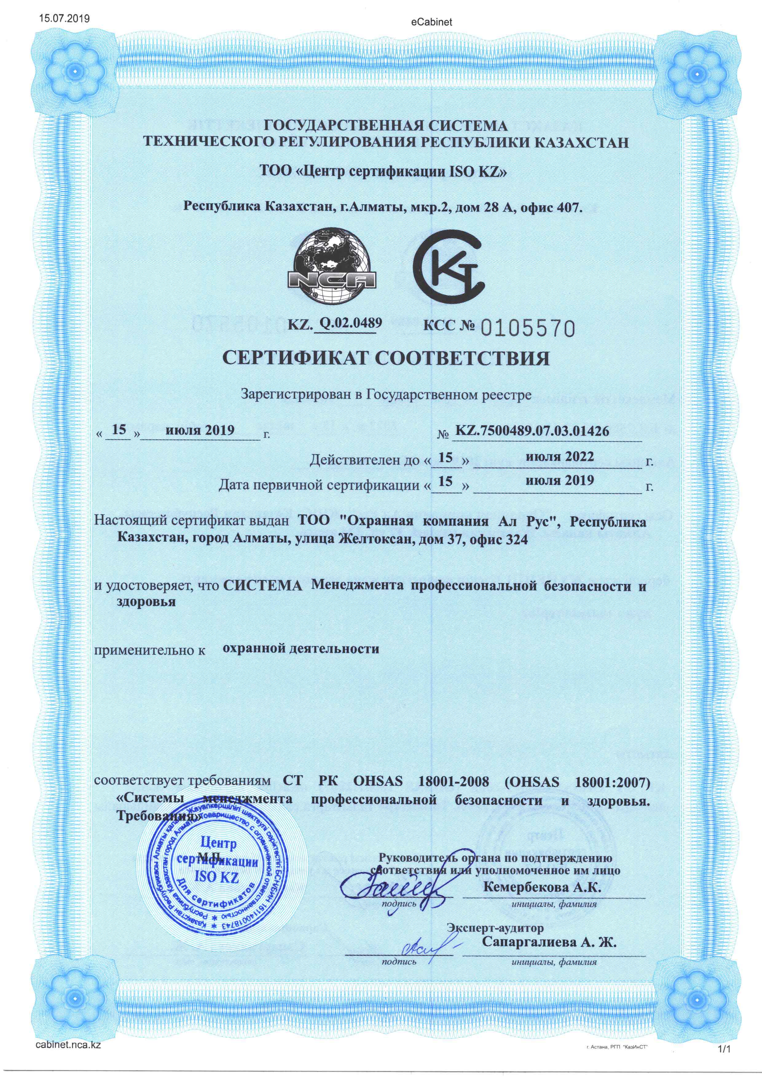 Сертификат "Система менеджмента профессиональной безопасности и здоровья"